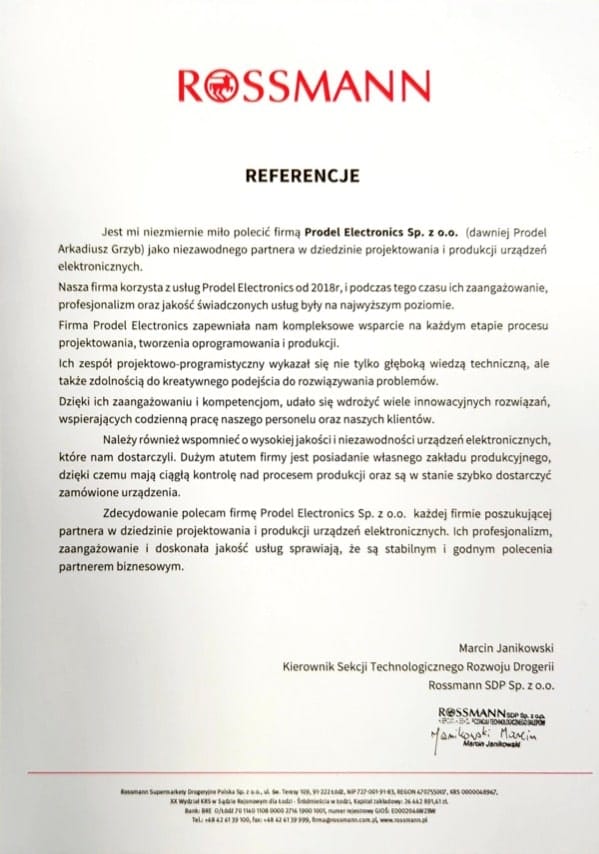 Z przyjemnością informujemy, że nasza firma, Prodel Electronics Sp. z o.o., otrzymała referencje od firmy Rossmann. Jest to dla nas ogromne wyróżnienie i potwierdzenie wysokiej jakości naszych usług oraz zaangażowania w realizację projektów na najwyższym poziomie.